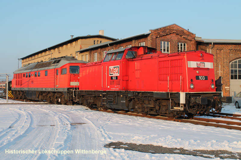 Am 12. Februar 2013 rollten unsere beiden Neuzugänge ins Bw Wittenberge. Zum einem ist es die Nr. 103 der MEG, die ehemalige 114 774-3, der DR und die Nr. 317 der MEG, die ehemalige 132 500-0 der DR. Foto: D. Kathke
