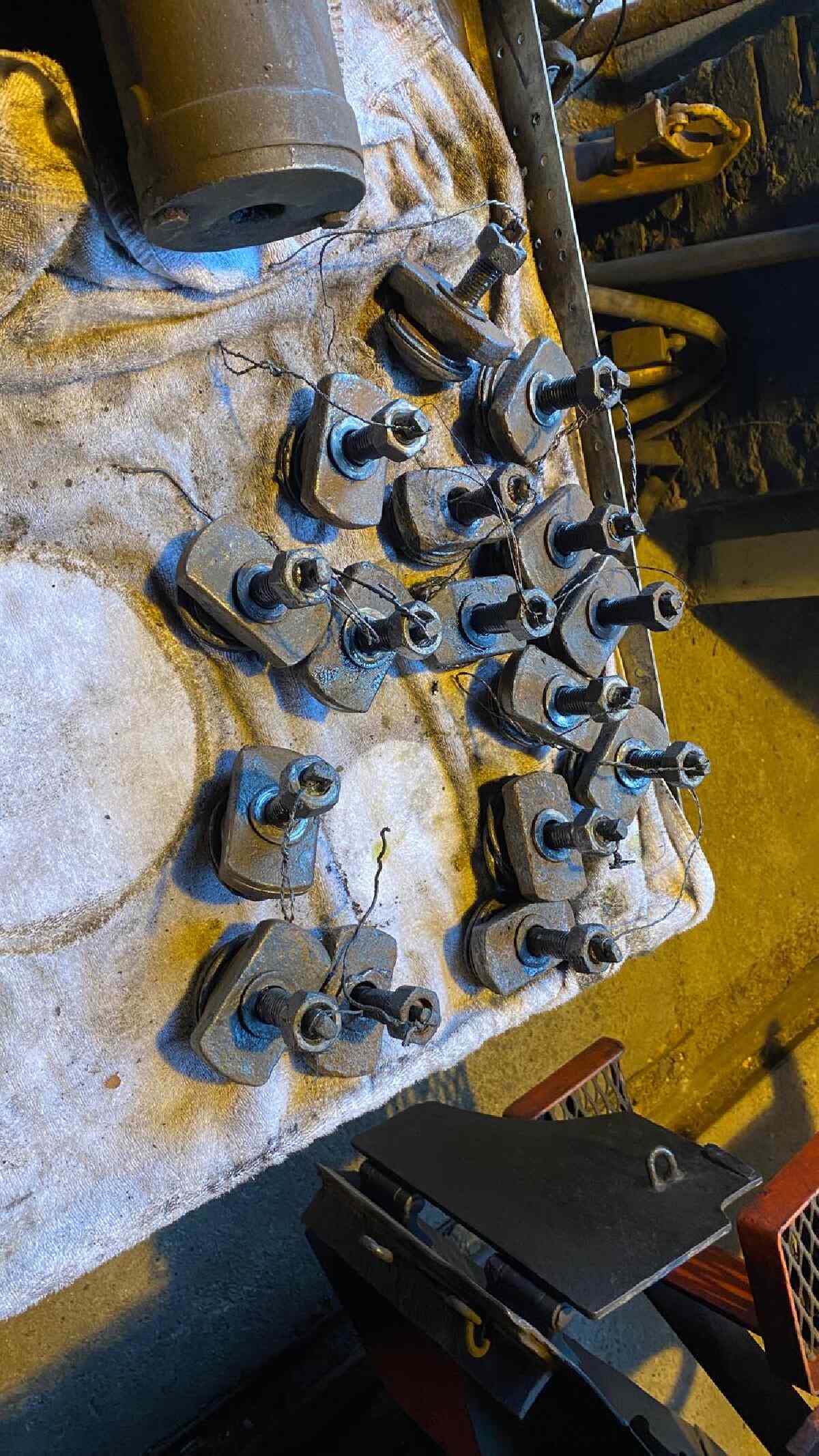 Dazu gehören insbesondere Arbeiten an unserer Dampflok 50 3570, die wir gerne im nächsten Jahr wieder betriebsfähig vorführen möchten. Dafür müssen wir etliche Arbeiten erledigen, die ziemlich zeitintensiv sind. Dazu gehört insbesondere die Kesselreparatur, die nun vorbereitet wird. Am vergangenen Samstag wurden einige Kräfte gebündelt, um den Kessel auszuwaschen. Dazu wurden alle Waschluken entfernt. Dabei handelt es sich um pilzförmige Verschlüsse, die kleine ovale Öffnungen in der Kesselwand abdichten, durch die man mit einem starken Wasserstrahl Verunreinigungen und Kalkrückstände aus dem Kessel herausspülen kann. Da die Muttern, die die Verschlüsse halten, manchmal extrem festsitzen, muss man sie teilweise mit einer Flamme rotglühend erhitzen, damit sie sich etwas ausdehnen und man sie lösen kann.